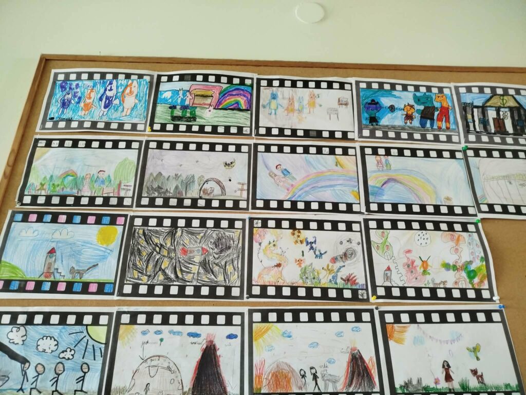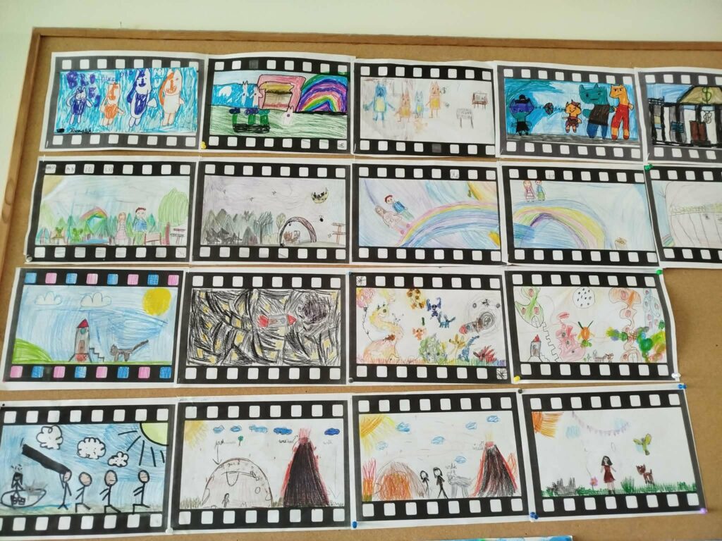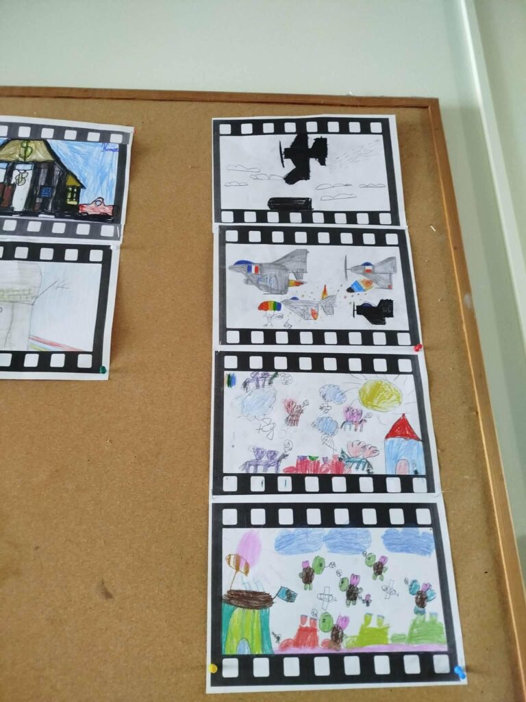 Na lekcjach rozmawiały również, o tym jak powstaje film i jakie filmy lubią oglądać. Podsumowaniem zajęć był stworzony w grupach rysynkowy scenariusz filmowy.