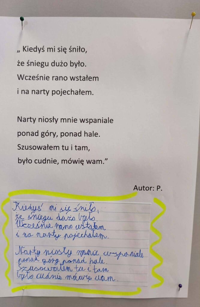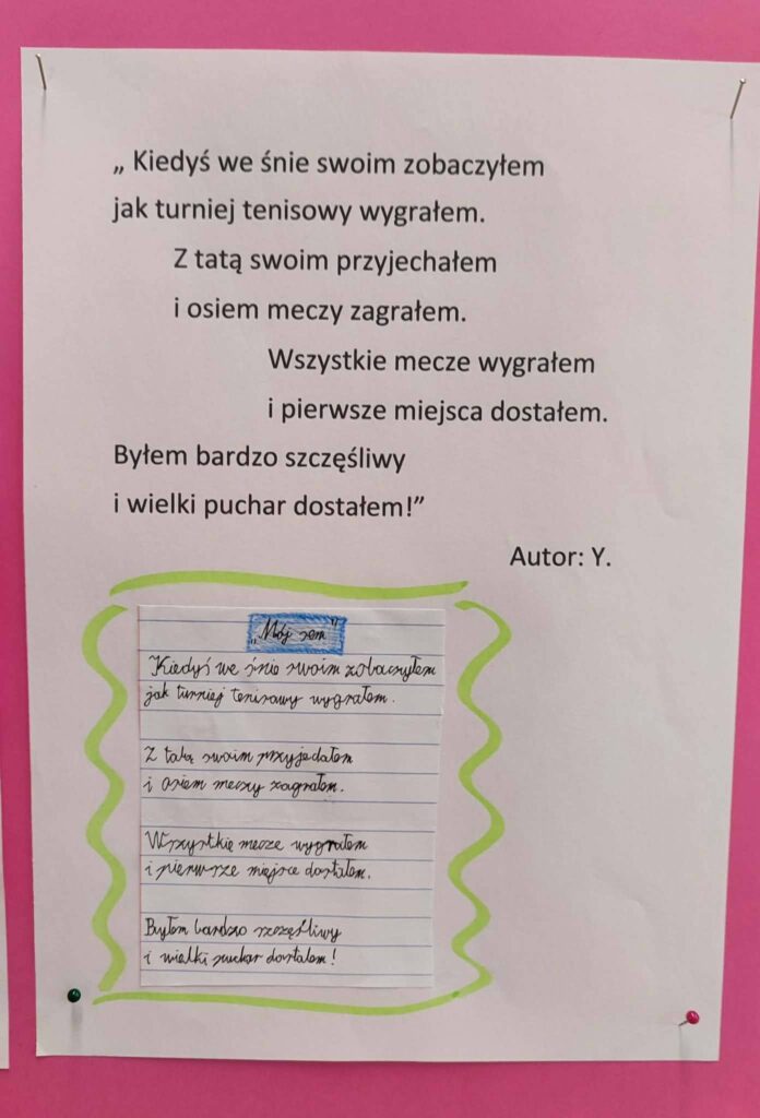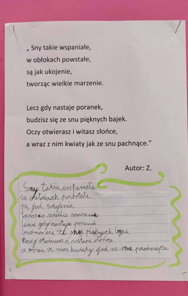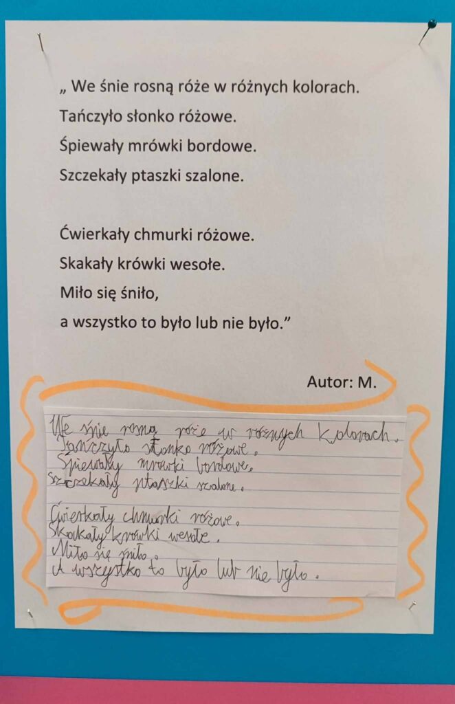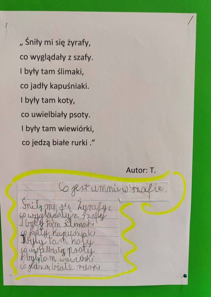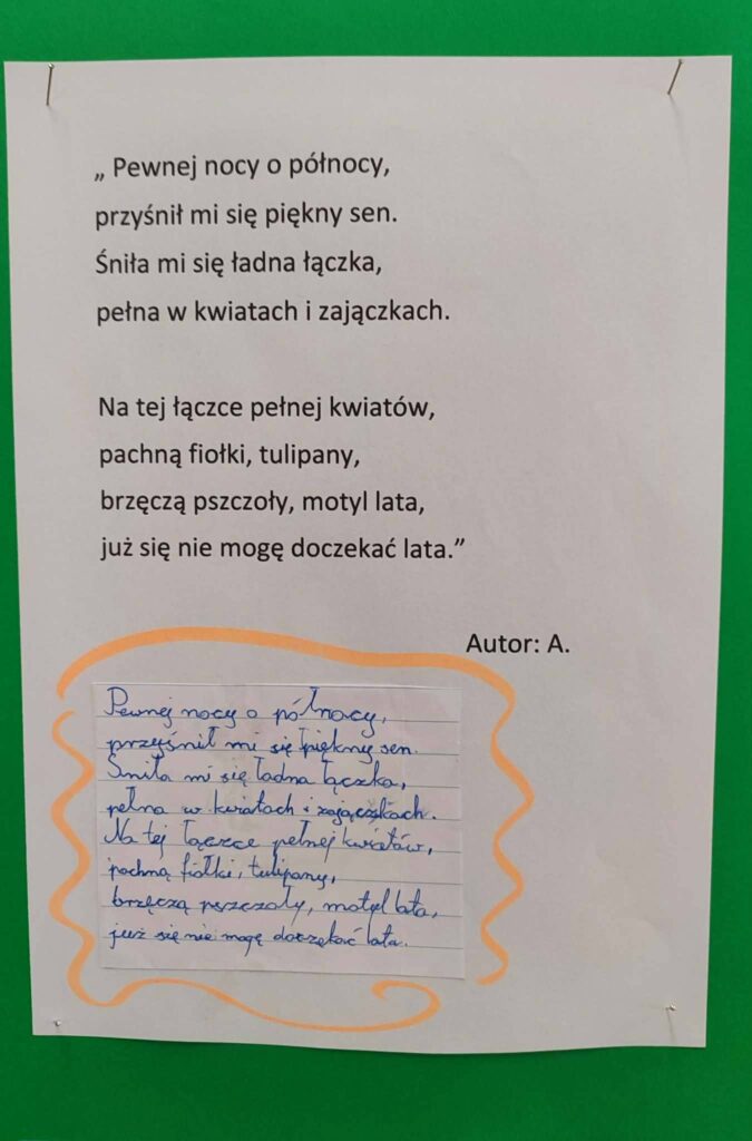 . Uczniowie zainspirowani wierszem „Pochwała snów” Wisławy Szymborskiej ułożyli i zapisali własne wiersze, w których – podobnie jak poetka – stali się wolni od ograniczeń czasu i miejsca, a nieraz niemożliwe mogło stać się prawdziwym. Uczniowie prezentują swoje literackie perełki, a w dowód ich oryginalności dołączają swoje osobiste rękopisy. Tworząc, ćwiczyli stosowanie rzeczowników, czasowników, przymiotników, liczebników, przysłówków, rymów, porównań… – a wszystko to przy użyciu własnej wyobraźni.