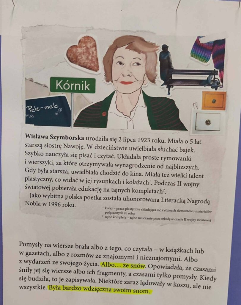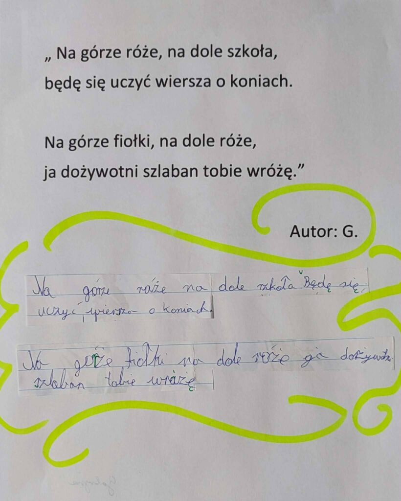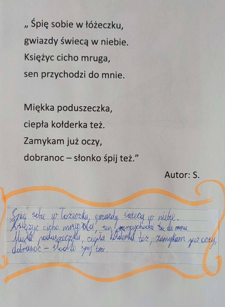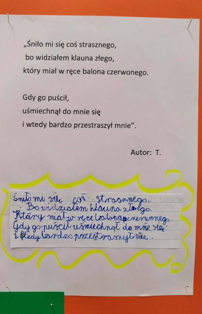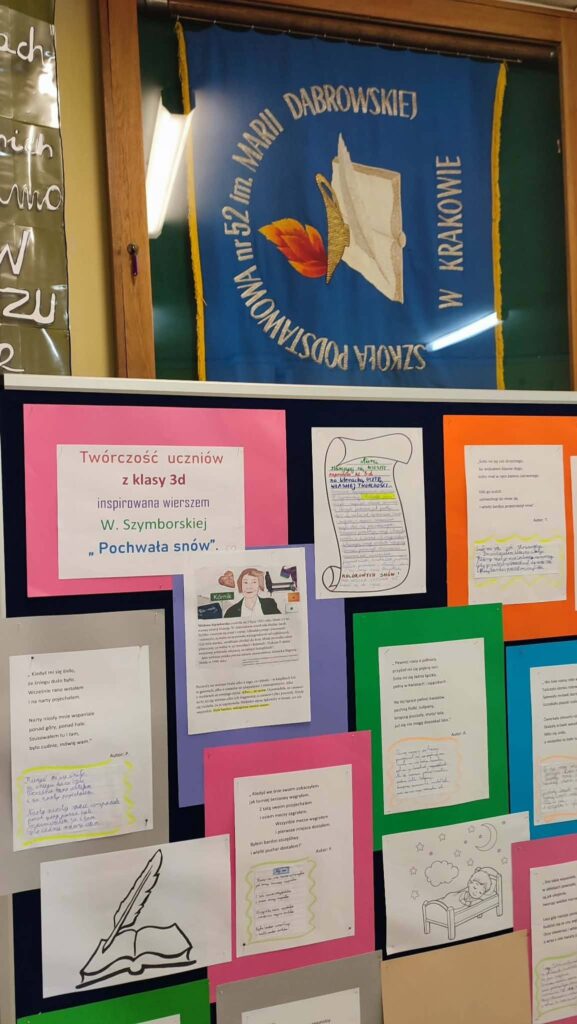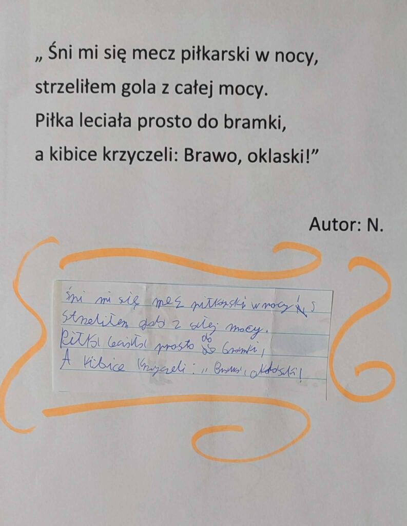 . Uczniowie zainspirowani wierszem „Pochwała snów” Wisławy Szymborskiej ułożyli i zapisali własne wiersze, w których – podobnie jak poetka – stali się wolni od ograniczeń czasu i miejsca, a nieraz niemożliwe mogło stać się prawdziwym. Uczniowie prezentują swoje literackie perełki, a w dowód ich oryginalności dołączają swoje osobiste rękopisy. Tworząc, ćwiczyli stosowanie rzeczowników, czasowników, przymiotników, liczebników, przysłówków, rymów, porównań… – a wszystko to przy użyciu własnej wyobraźni.